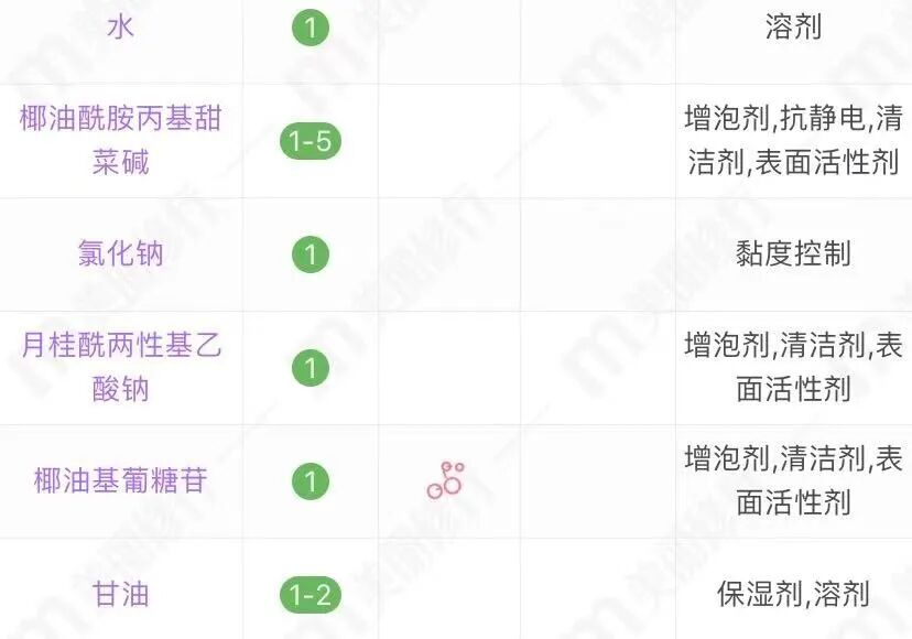 它是非皂基的洗护产品,所以能够减少对肌肤的刺激,而且还是无泪配方,不小心掉到眼睛里也没刺激。成分表中没有危险成分,没有paraben类防腐剂,但是含有少量香精。