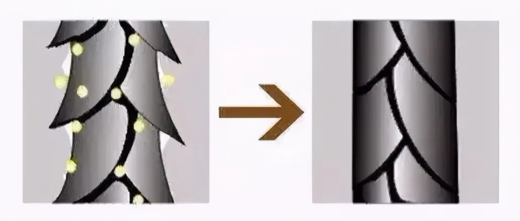 我们仔细看头发的表面其实是有毛鳞片的,为什么头发会变得干燥,分叉就是因为毛鳞片受损: