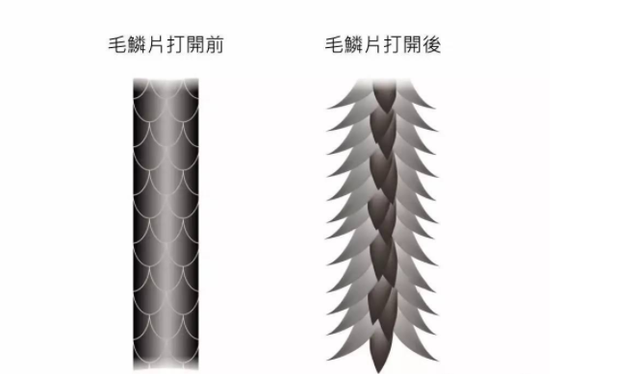 毛鳞片是有生长方向的,如果毛鳞片顺着生长头发会柔顺,如果毛鳞片竖起来头发则会变得干燥、分叉。
