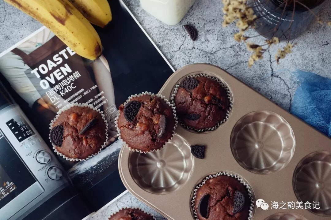 【材料】低筋面粉93克,可可粉12克,无铝泡打粉5克,熟香蕉果肉140克,鸡蛋1个,玉米油50克,细砂糖40克,巧克力豆50克,水36克,盐一点点,奥利奥MINI小饼干(可以做6-7个纸杯蛋糕)
