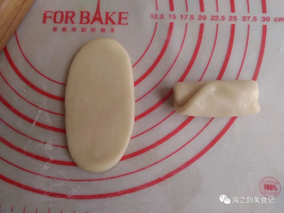12、擀成椭圆形,翻面,再卷起来,收口朝上(图左到右),松驰15分钟。