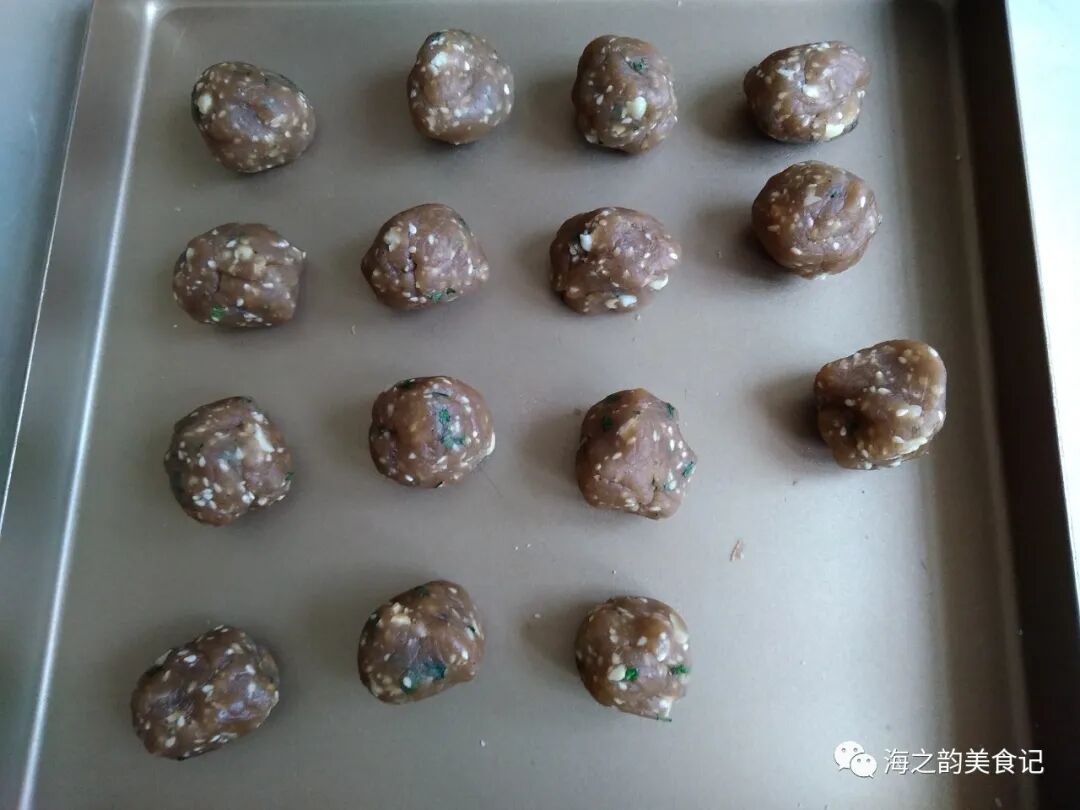 5、将葱沥干水分切成葱花,放在烤盘上,用100度烤箱烘烤8分钟左右。花生仁用炒锅炒香,去掉外衣,用擀成棍擀碎,用手捏碎也可以。将馅料的材料全部拌在一起,分成每个23克,搓圆备用。