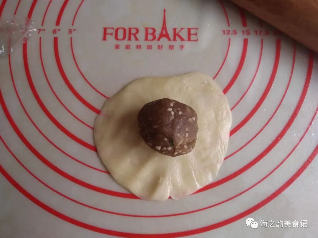 15、擀成圆形,放上馅料。