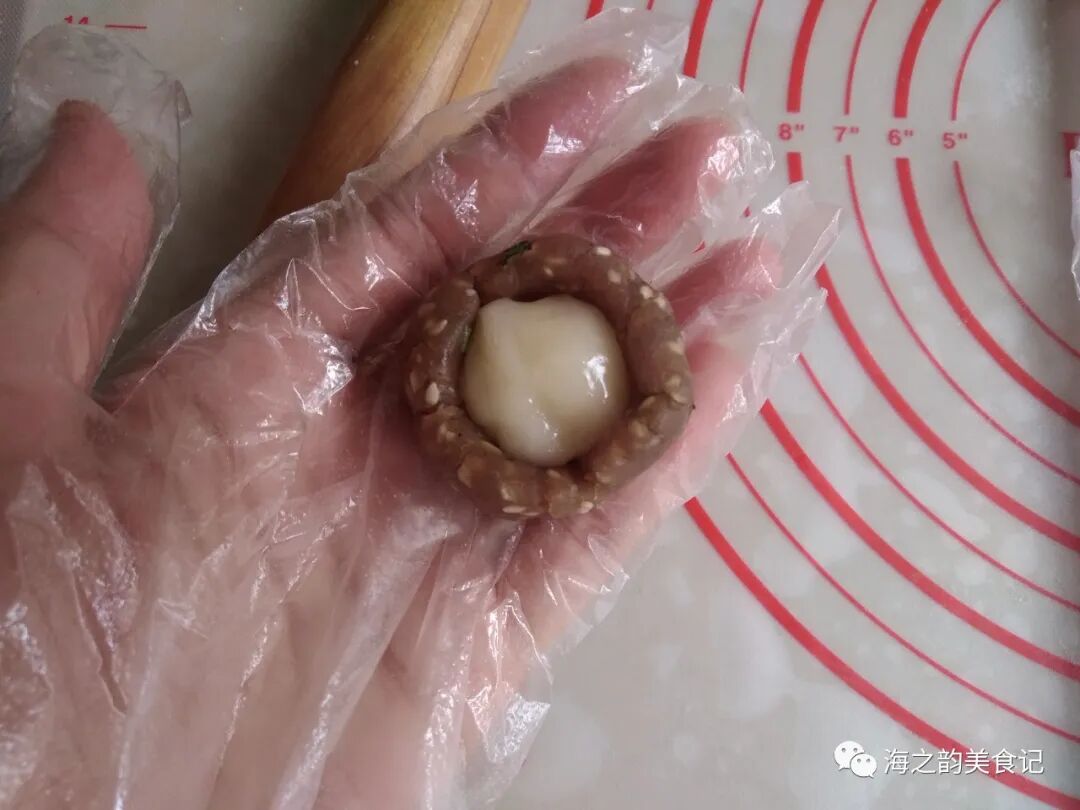 8、咸甜馅压成碗状,放入麻薯。