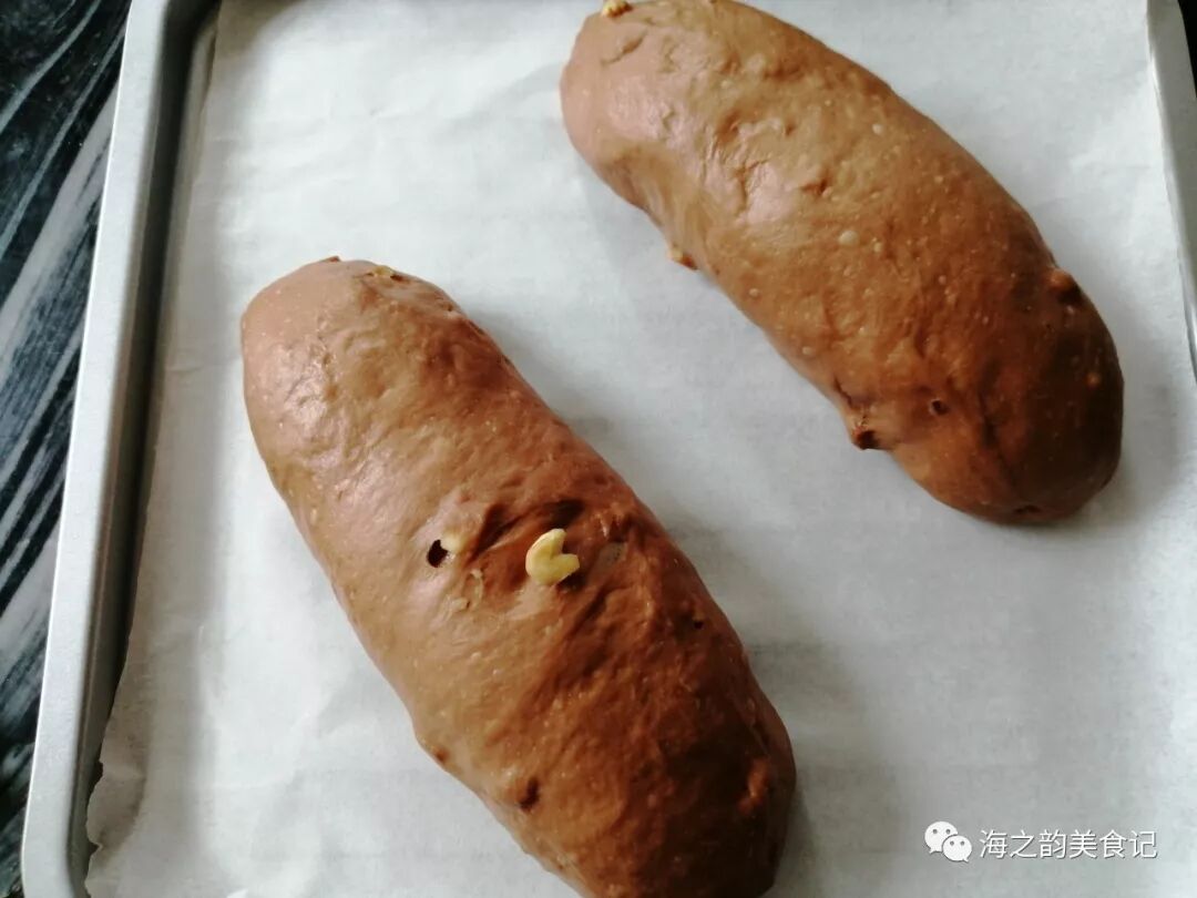 如果你在外面买有巧克力的面包,大多数店家使用的只是代可可脂,因为代可可脂的巧克力价格便宜很多。自己做的当然要用纯可可脂,代可可脂是不健康的。经过高温烘烤,巧克力豆已经溶化成巧克力酱了,香滑的口感,非常好吃。