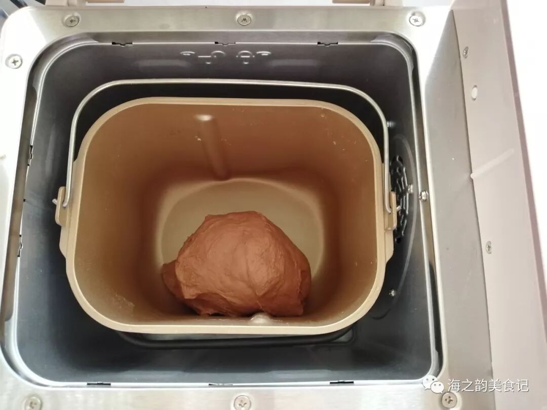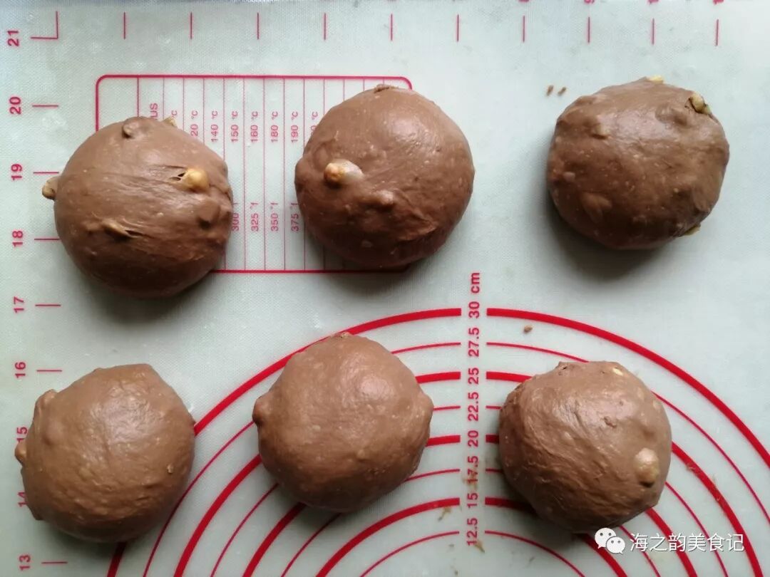 【材料】新良日式面包粉250克,可可粉13克,细砂糖34克,盐3克,冰水175克,耐高糖酵母3克,黄油25克,坚果碎35克,黑巧克力豆72粒,软化用黄油15克