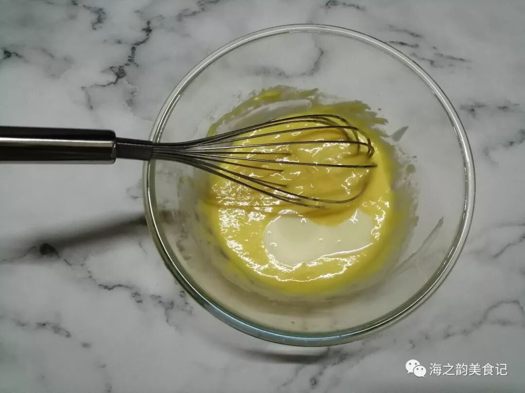 2、用蛋抽划一字搅拌均匀,放凉一下,用手触摸一下打蛋盆,不热了,即可把1个全蛋和3个蛋黄倒入。