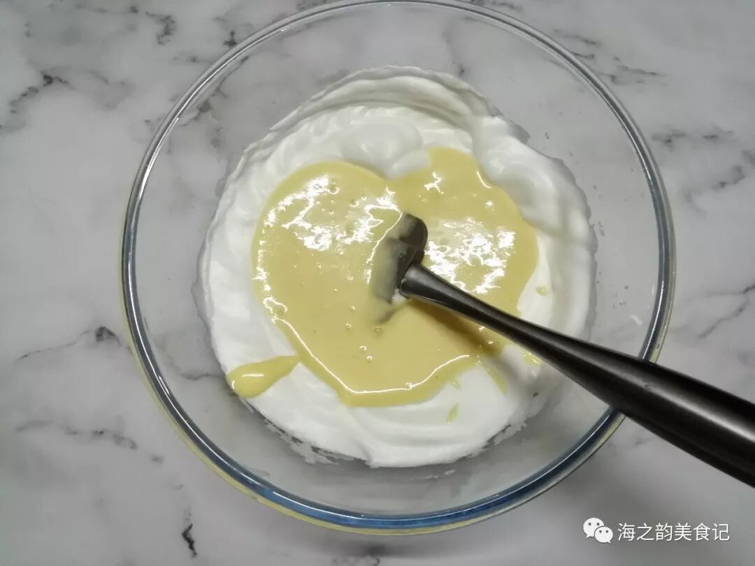 5、用刮刀把1/3打发好的蛋白霜倒入蛋黄糊里,从底部向上翻拌并切拌均匀。