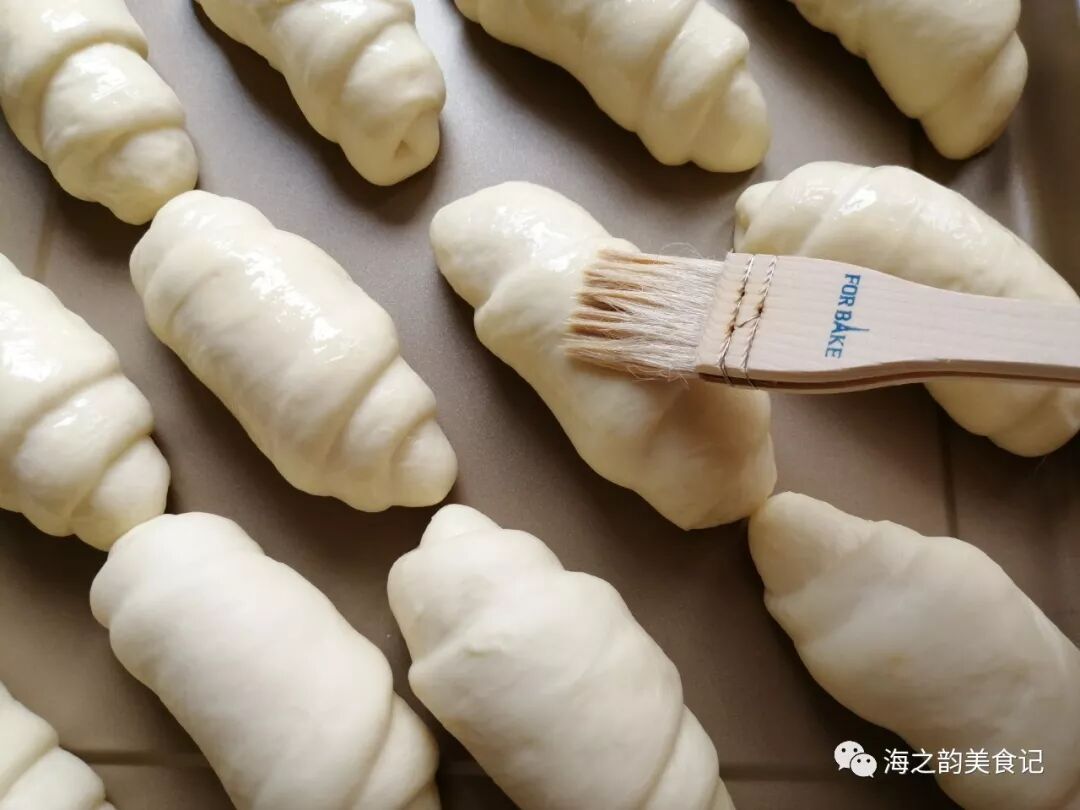 8、把面包胚放入烤箱(并放置一碗热水,使烤箱达到一定的湿度),用烤箱的发酵档35度,使面包胚发酵两倍大,在上面用毛刷刷上全蛋液,这样烤好的面包色泽更漂亮。