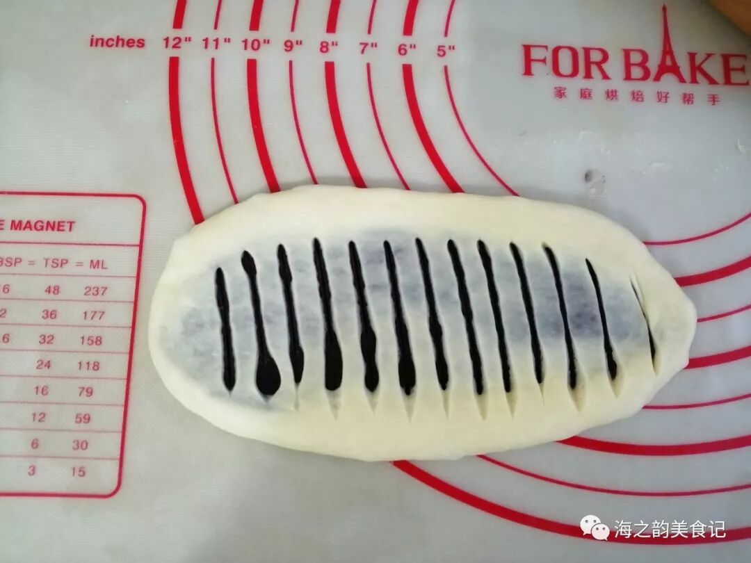 8、用面包割刀割出若干割口,见到馅料即可,不要割破下面那一层。