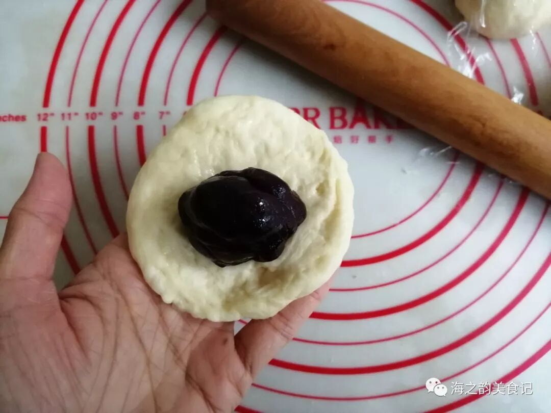 5、将面团擀圆,翻面,光滑面朝下,放入搓成圆形的30克紫薯馅。