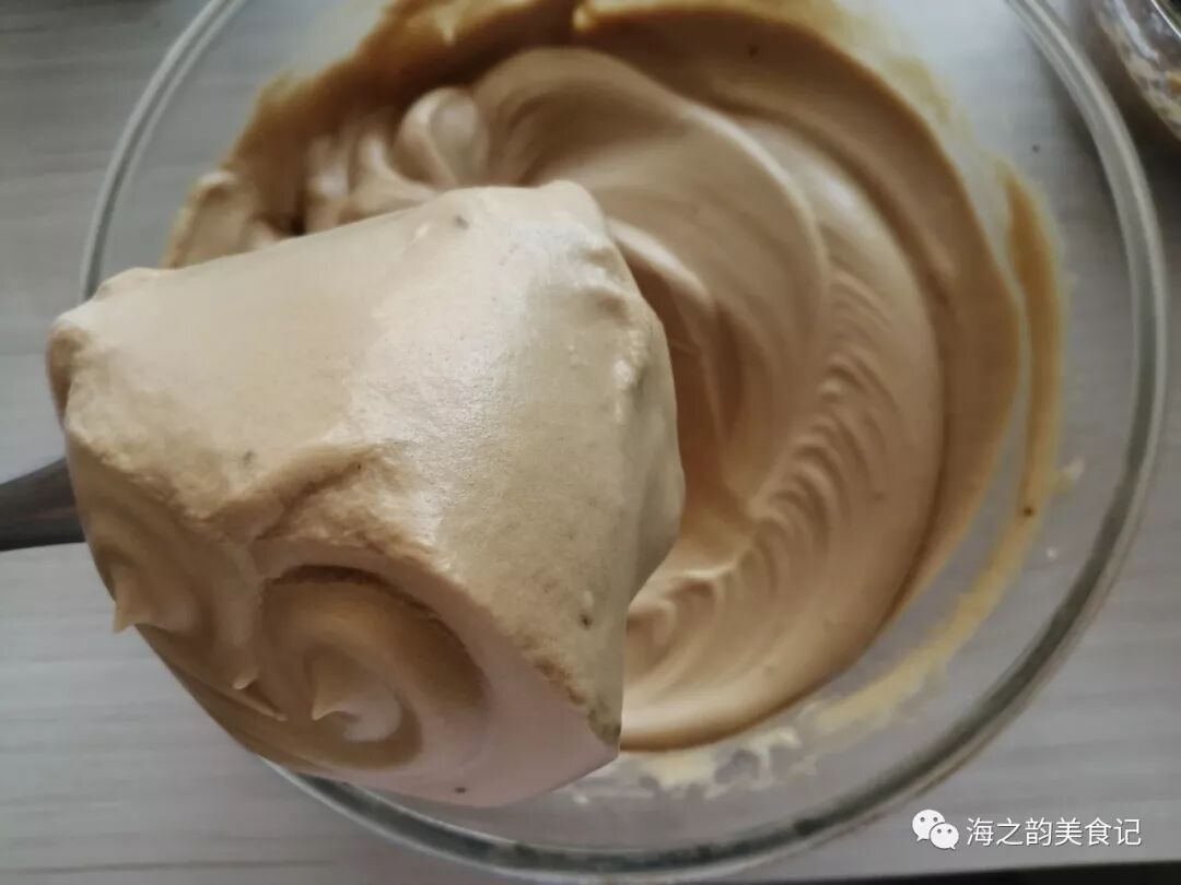 5、蛋清里分3次加入剩余的50克红糖,用电动打蛋器打至偏干性发泡。
