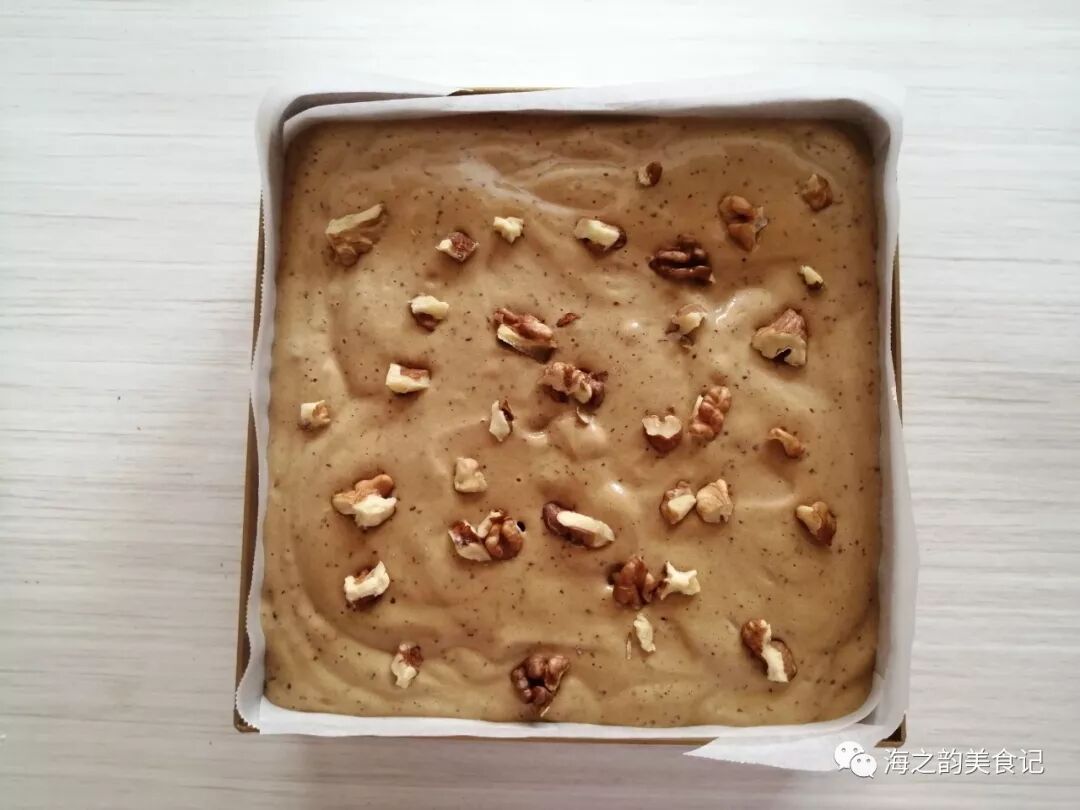 9、把蛋糕糊倒入已经铺了油纸的法焙客加高方形蛋糕模具里,在桌面上震出气泡,表面撒上核桃碎装饰。