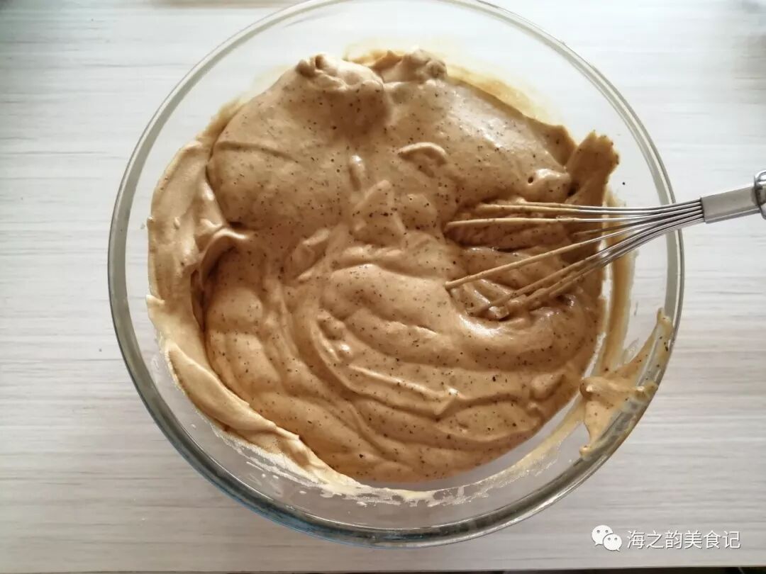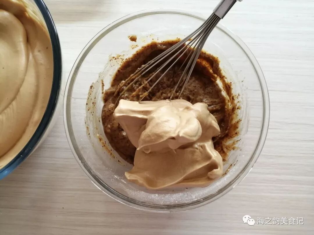 6、把1/3打发好的蛋白霜舀入到蛋黄糊里,用手动打蛋器从底部向上翻拌均匀。