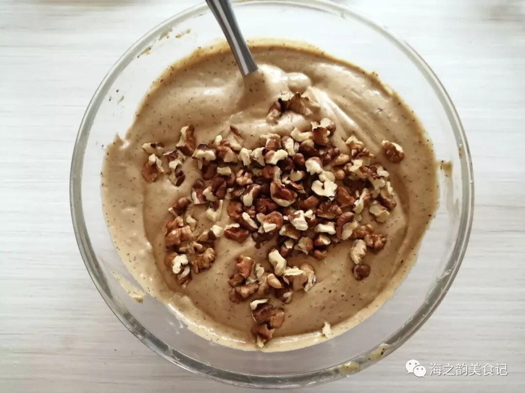 8、然后倒回剩余的蛋白霜里,用同样的手法拌好,倒入核桃碎,拌几下即可。