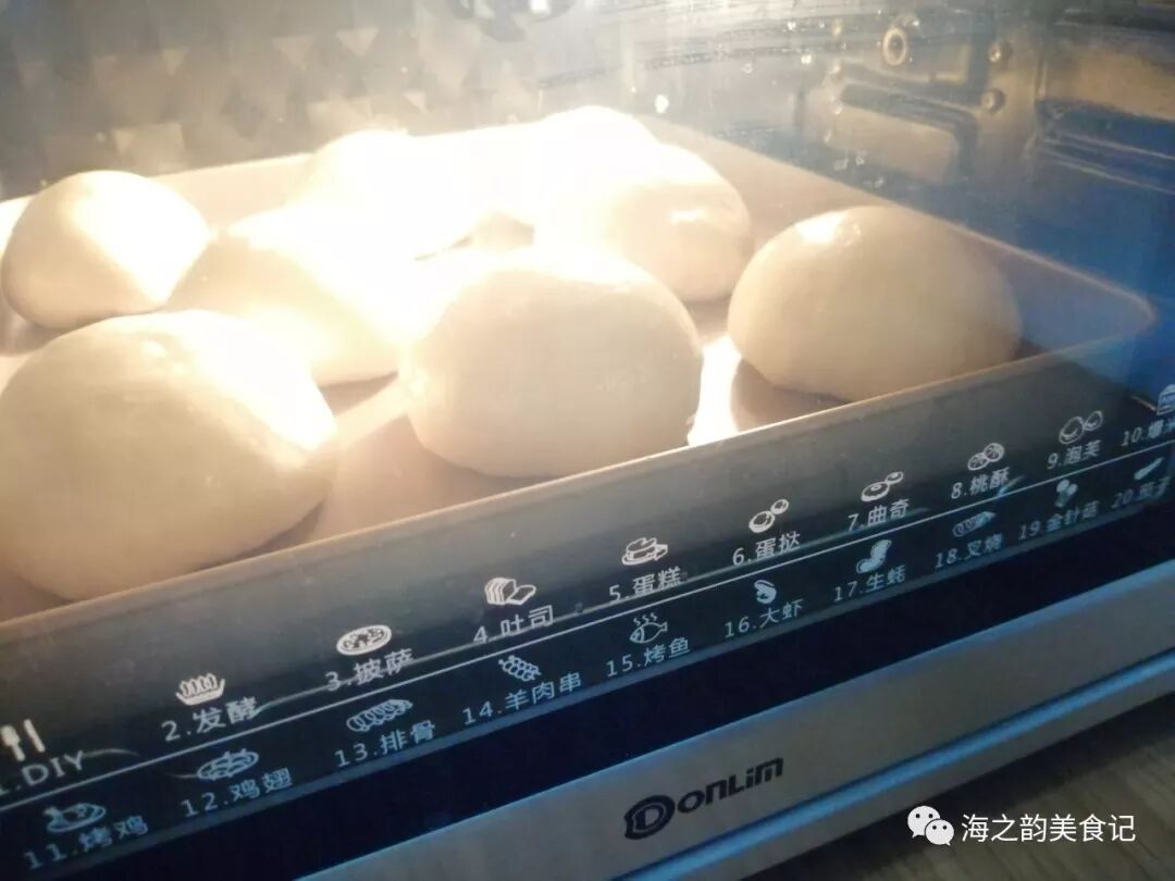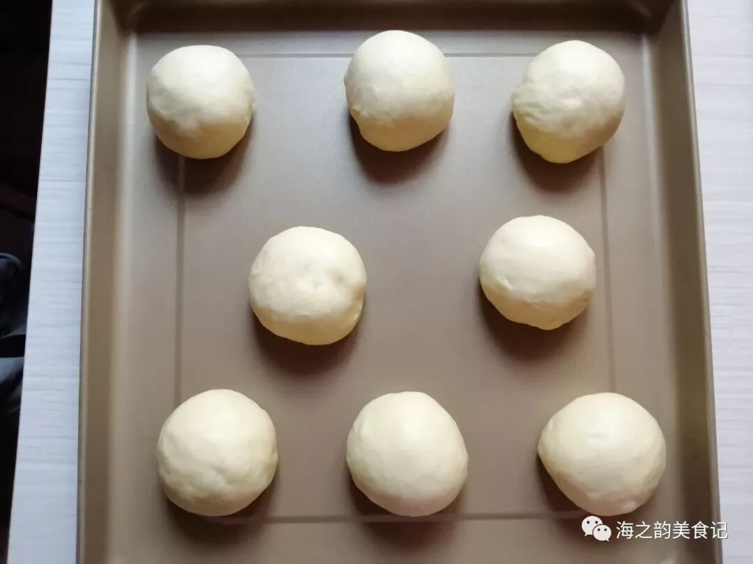 6、把面包胚放入烤箱内,选择发酵档33度(内置一碗热水,使烤箱保持一定的湿度),发酵50分钟左右,视面包胚的发酵状态而定,发酵有1.5-2倍大。发酵好后,把面包胚取出,用毛刷在表面刷上一层全蛋液,放入已经预热到上火165度,下火170度的烤箱下层(烤箱预热时间大概是10分钟),烘烤15分钟左右。(实际烘烤温度要根据自家烤箱脾气而定,若温度不准,最好是买个烤箱温度计测量)