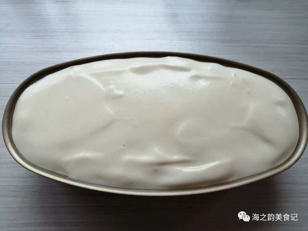 6、拌好的蛋糕糊很细腻,倒入模具里,刮平一下表面,这个蛋糕糊的量比较多,几乎与模具持平。