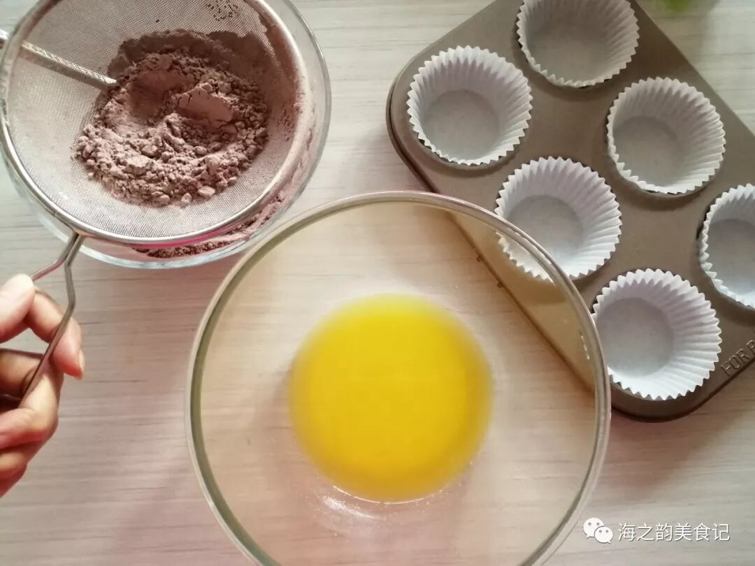 1、把可可粉、面粉和泡打粉混合后过筛两遍,黄油切小块,隔热水融化成液体,6连模中放入蛋糕纸托。