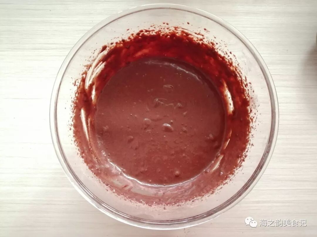 5、用手抽拌几下,拌至没有干粉状态,然后用电动打蛋器搅拌至顺滑的稀面糊。