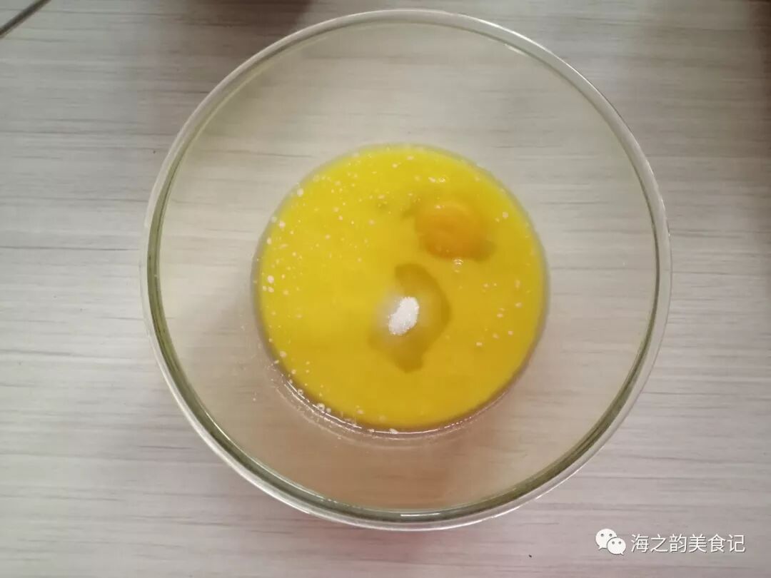 2、把牛奶、鸡蛋、糖和盐都倒入黄油液中。