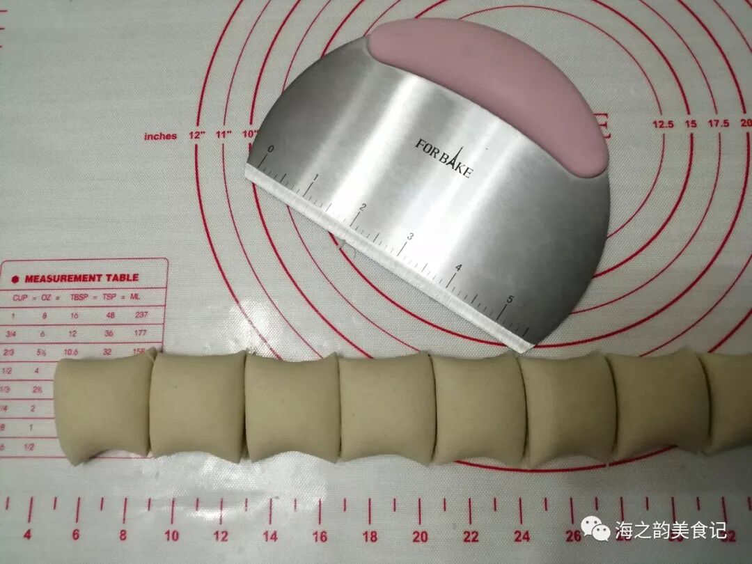 3、发酵好的面团要充分揉匀排气,手揉几分钟,这样切面没有气孔,蒸出来才光滑,不会坑坑洼洼。搓成长条,切成12份。我是做了6个肠仔卷加6个馒头。