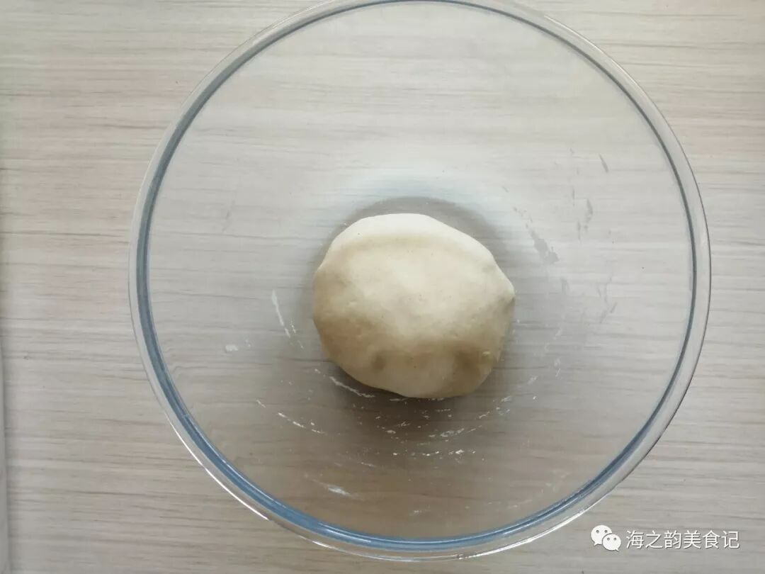 2、一边倒水,一边用筷子把面粉拌成絮状,再用手把它们捏在一起,揉成光滑的面团。刚开始面团可能比较难揉光滑,静置3-5分钟再揉,你会发现面团易揉很多了。揉好的面团放在和面盆里,盖上盖子,室温下发酵1.5倍大,大概发酵了40分钟。