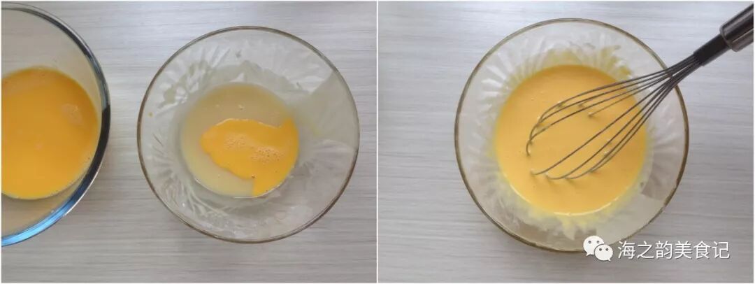 3、3个蛋黄和1个全蛋打入搅拌盆里,另3个蛋清放在无水无油盆里,先放冰箱备用。