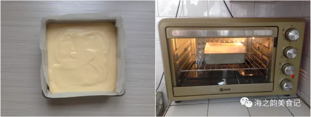 12、烤盘里装热水,放入已经提前预热到150度的烤箱最下面一层,模具放烤架上,放倒数第二层,烘烤50分钟左右(烘烤温度依个人烤箱脾气而定)。烤好的蛋糕,不用倒扣,放凉切片即可。