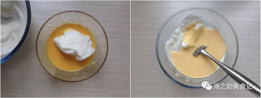 9、取三分之一打发好的蛋白霜到蛋黄糊里,用刮刀切拌均匀,。