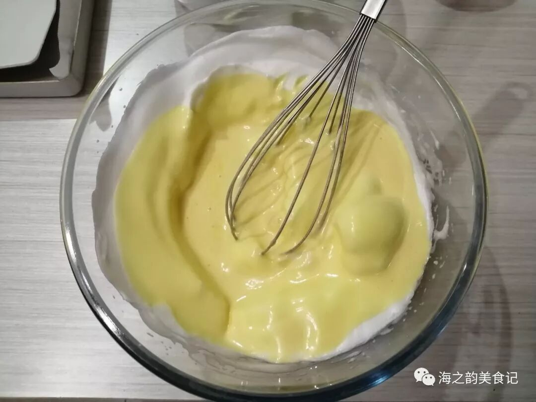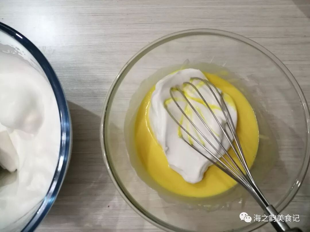 6、拌好的蛋糕糊倒入剩余的蛋白霜里,用同样的手法翻拌,大概要拌二十几下。