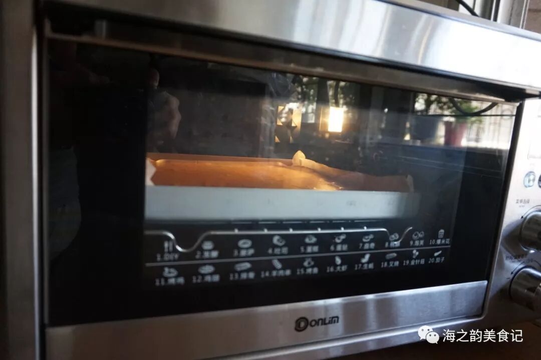 8、把蛋糕盘放入已经预热到上下火170度的烤箱最下面一层的烤架上(烤箱一定要提前预热,大概需要预热10分钟,我一般在开始拌牛奶和油的时候预热),烘烤20-22分钟左右,实际烘烤温度要根据自家烤箱脾气而定。有的烤箱是把蛋糕盘放在中下层的,所以还是要根据你家烤箱脾气决定。我有时会在烘烤最后两分钟,把蛋糕盘移上一层。蛋糕卷烤的时间不要太长,否则蛋糕发干,也易裂。