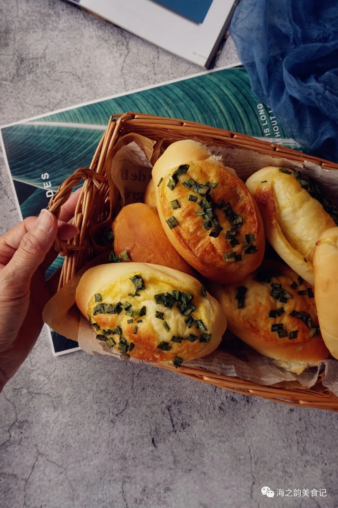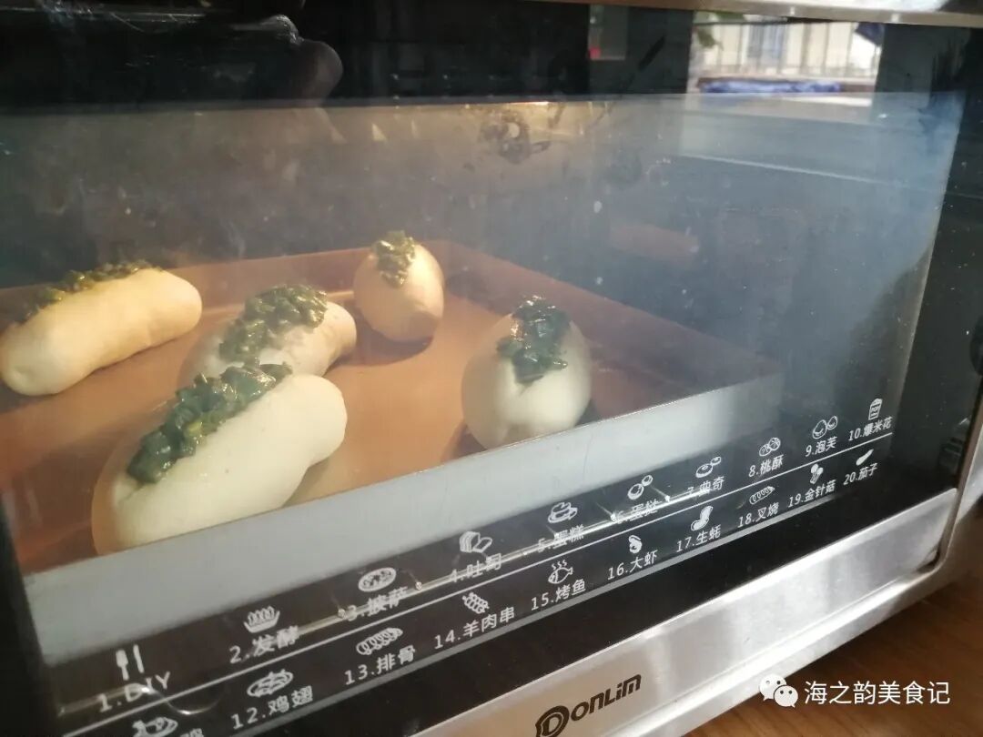12、烘烤时整个屋子都弥漫着香葱的味道,烘烤结束,把面包取出,放在晾架上晾凉,未食用的面包,放入保鲜袋中扎紧袋口,室温下保存即可。