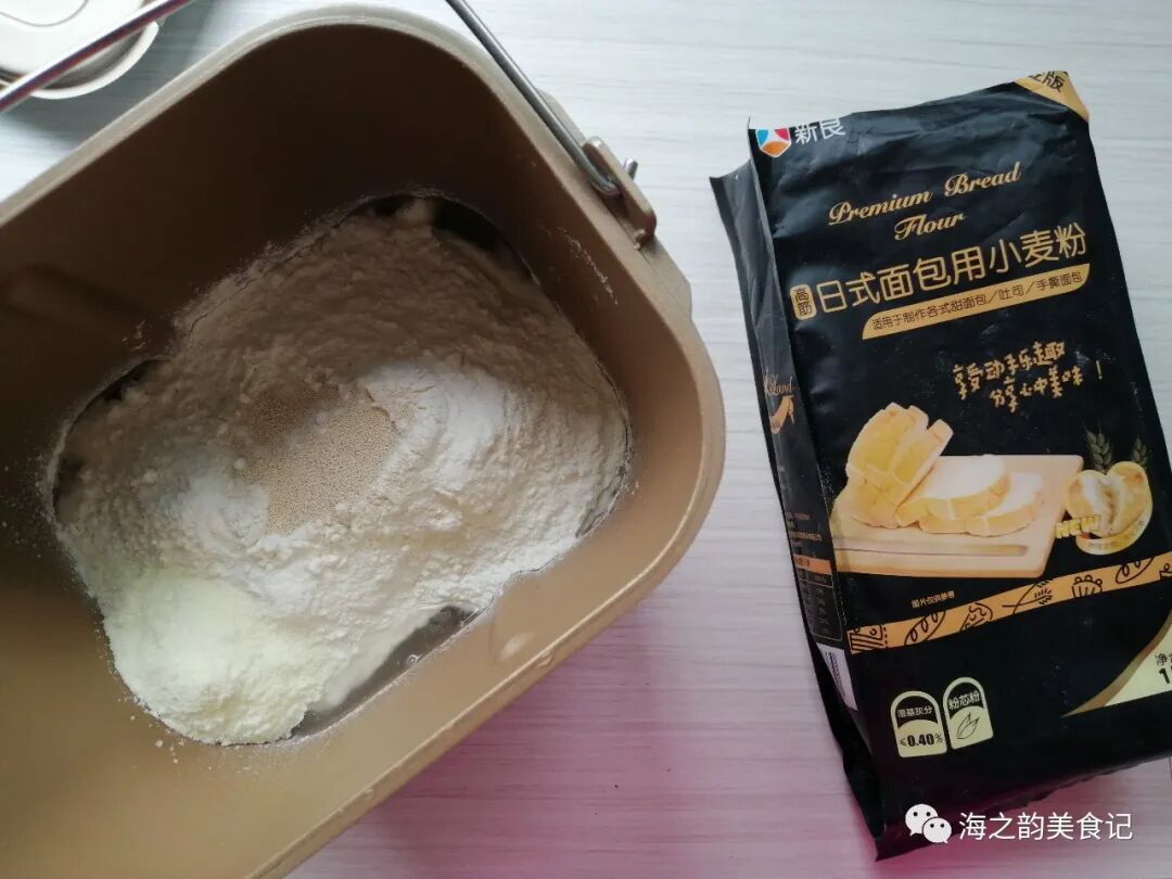 1、依次放入冰水、蛋液,对角放糖和盐,再倒入奶粉和面粉,在面粉顶端放入酵母。