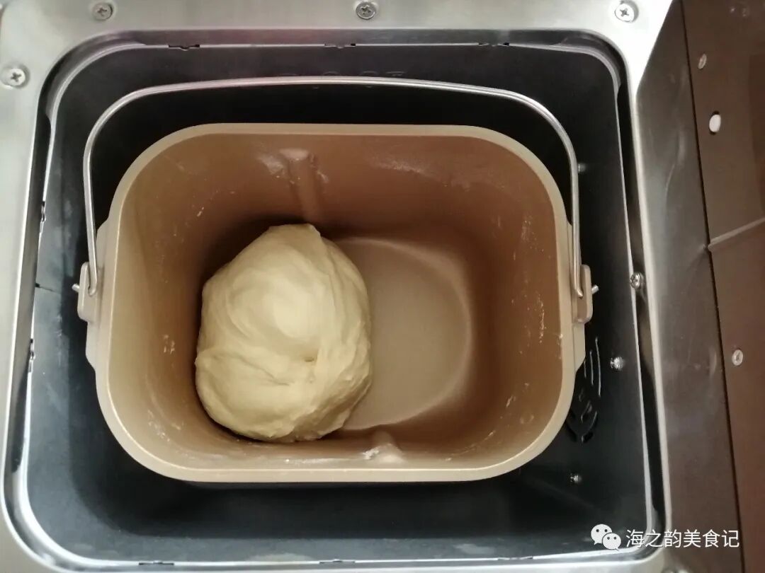 3、在和面结束后加入切成小块的黄油,继续选择和面17分钟。(不同型号的面包机和面时间会有所不同)