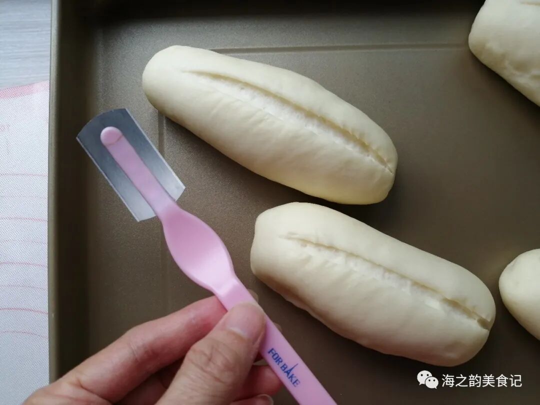 9、做好放在烤盘上,放入烤箱,用烤箱的发酵档35度,发酵45分钟左右(时间仅供参考),面包胚发酵有两倍大(烤箱内放置一碗温热水,使烤箱达到一定的湿度)。用割包刀在面包胚表面割一刀,要割得比较深一点。