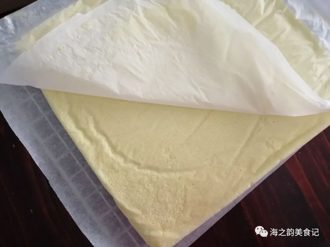 9、放入已经提前预热到170度的烤箱中下层,烘烤18分钟左右,因各家烤箱脾气不同,温度仅供参考,蛋糕表面不要烤得太干,否则卷的时候也容易裂开。