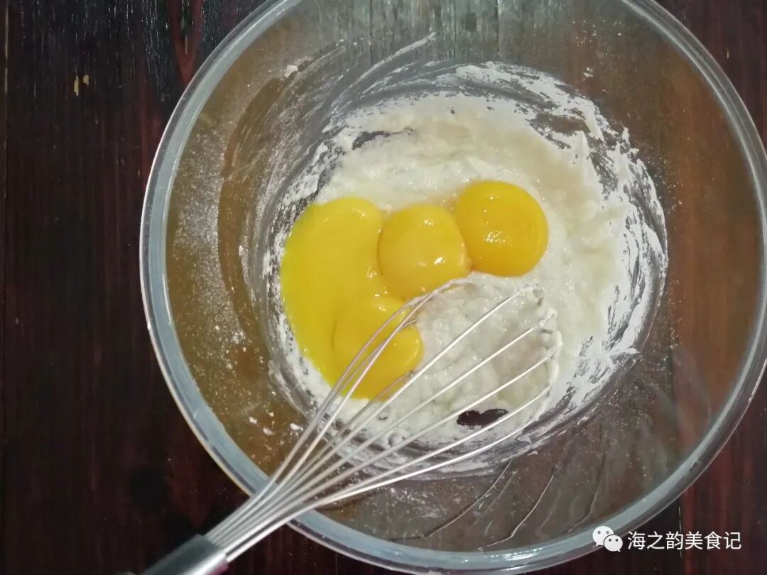 食材:低筋面粉45克,鸡蛋4个,玉米油30克,细砂糖30克,盐2-3克,水(或牛奶)40克,香葱粒适量