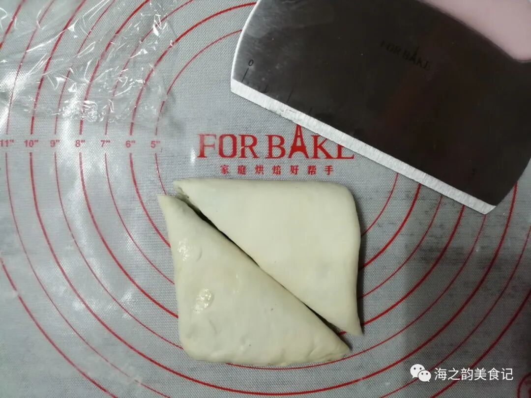 6、把面皮对折,成一个方形,用擀面棍再轻轻擀压一下,用切面刀对角切开,成两个三角形,这样可以做出6个烤饼胚。