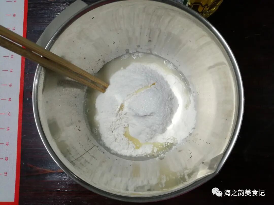 1、盆里倒入温水,酵母倒入,用筷子搅拌至酵母溶化,把面粉、玉米油、糖和盐都倒入盆中。