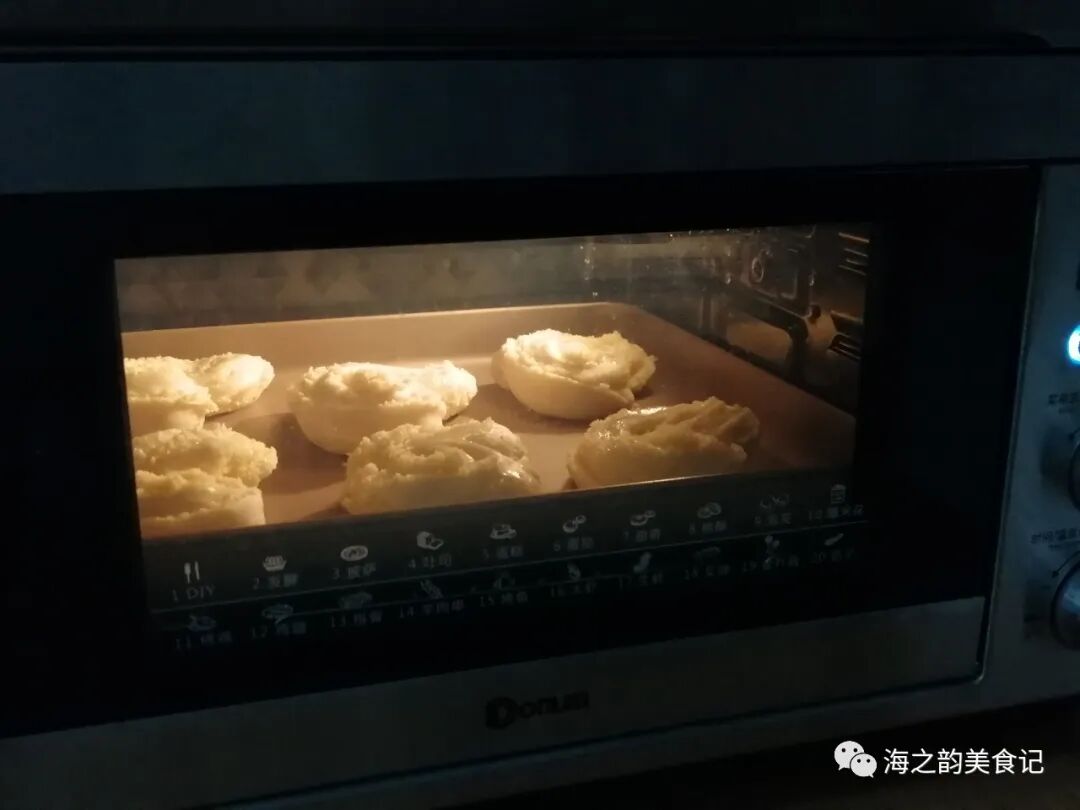 12、发酵到两倍大时,把面包胚取出,烤箱预热到上火165度,下火170度,预热时间大概需要10-13分钟。预热好后,才把烤盘放在烤箱的中下层烤架上,烘烤15-18分钟。实际烘烤温度要根据自家烤箱脾气而定。