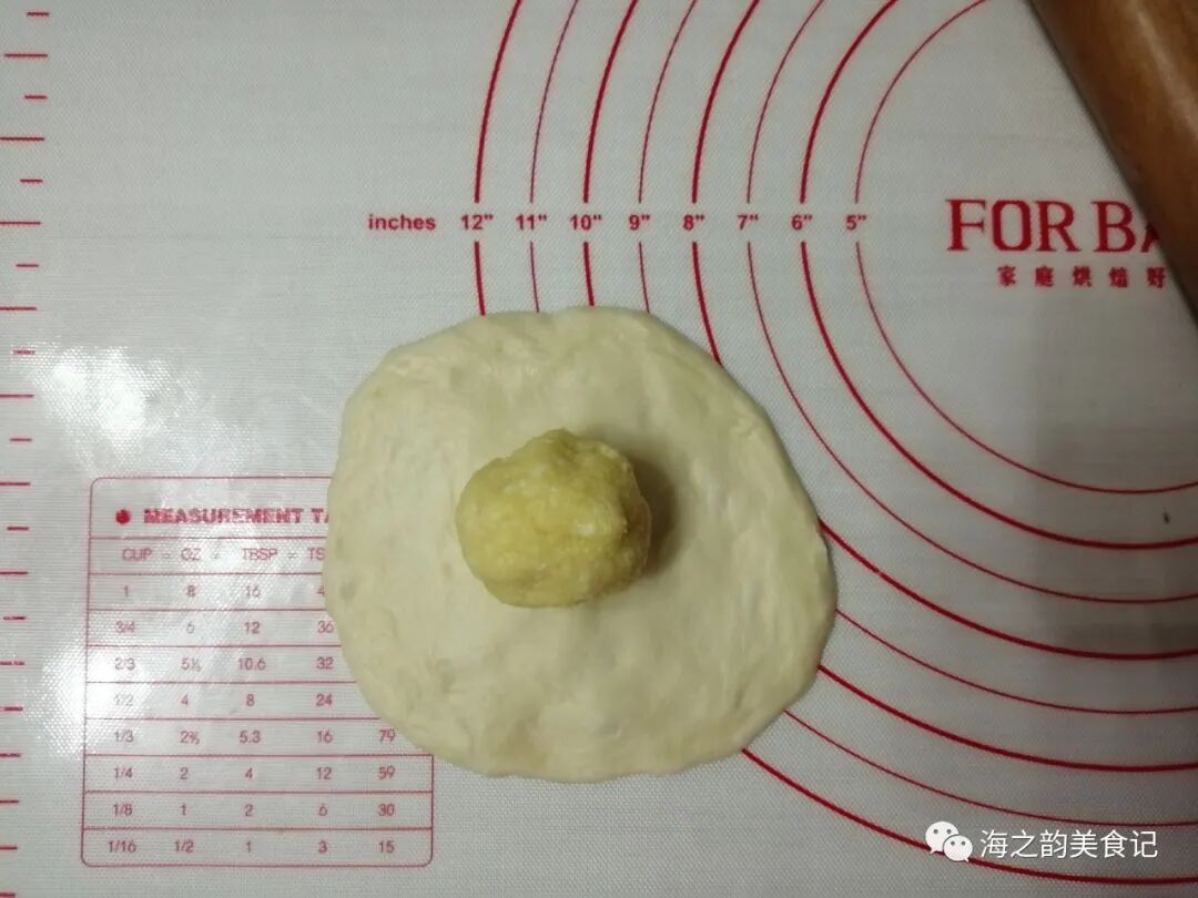 6、小面团擀圆,包入搓圆的馅料,捏紧收口,收口朝下。