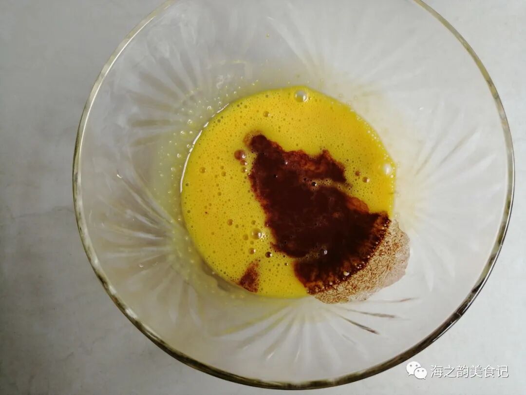 2、蛋黄搅散,加入油拌均匀后,倒入可可液继续搅拌均匀。