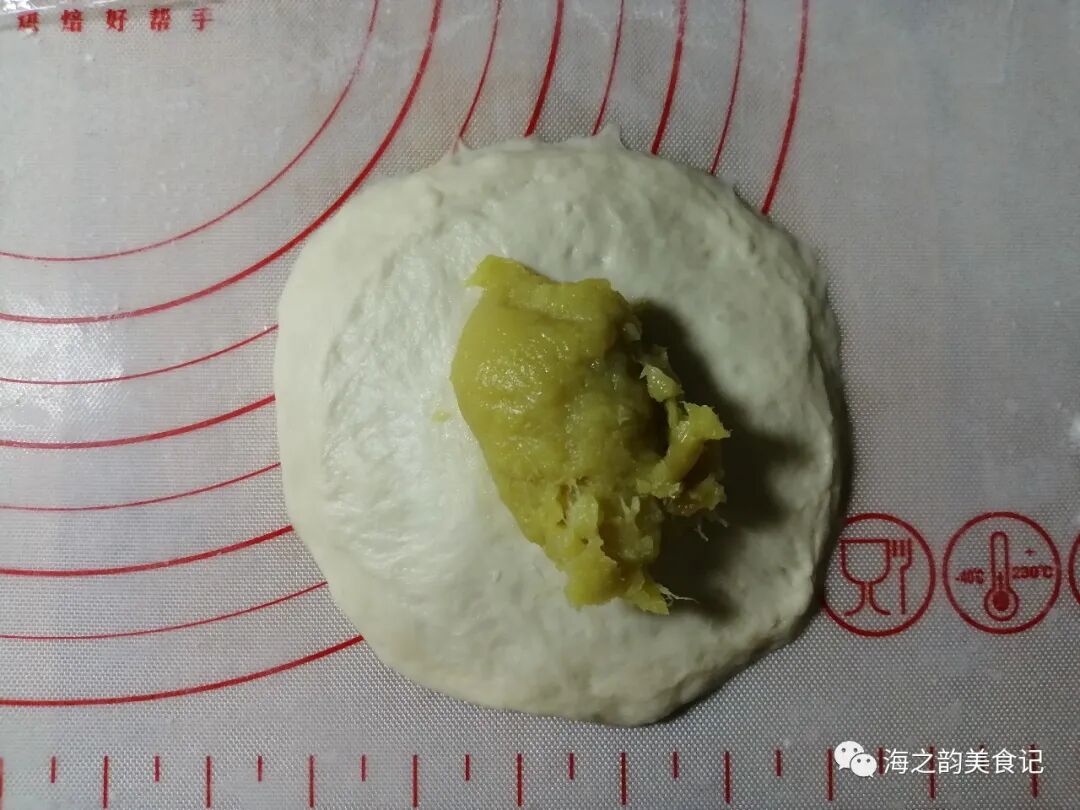 6、把松弛后的小面团压平一下,擀成圆形,不要擀得太薄,中间放入榴莲馅。(若面团有点粘揉面垫的话,可以在揉面垫上撒上一层薄薄的面粉)