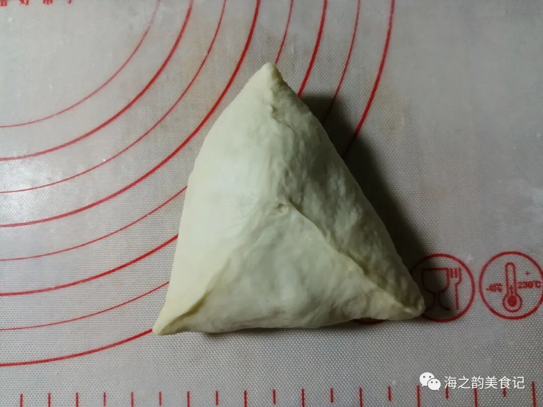 7、先左右两端捏合,再两边提起捏合,包成三角形。一定要捏紧,避免发酵和烘烤时爆开,露出馅料。