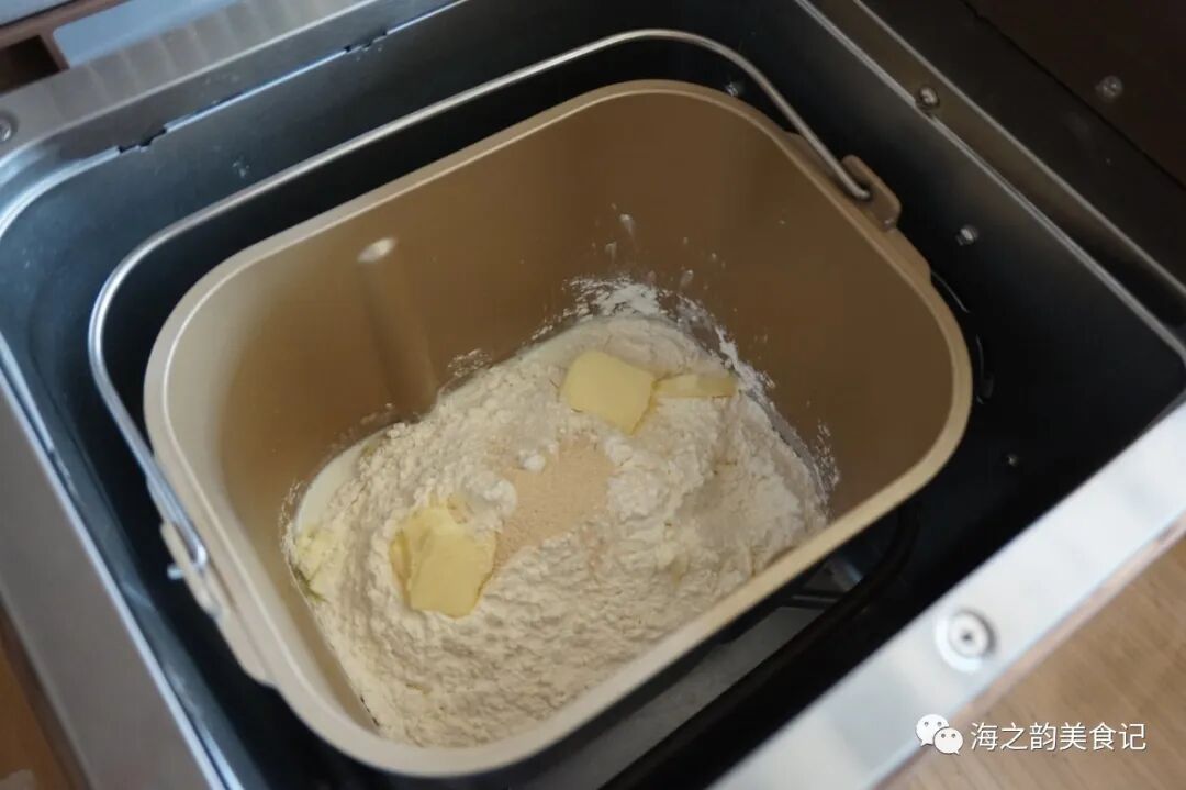 2、在面粉顶端加入酵母和切成小块的黄油,面包桶放入到东菱面包机里。
