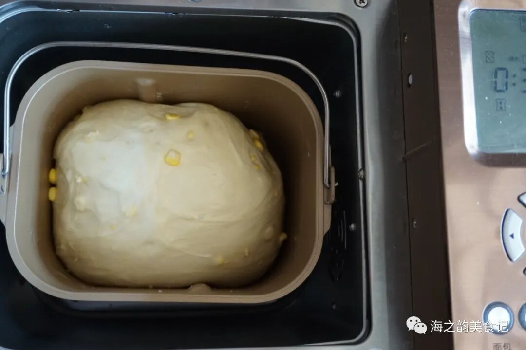 5、在和面结束前3分钟,会听到“啪啪”的一声,是果料盒打开的声音,玉米粒投入,继续揉面。