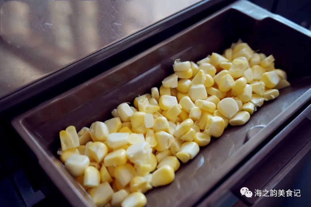 3、把沥干水分的甜玉米粒放入面包机的果料盒里。