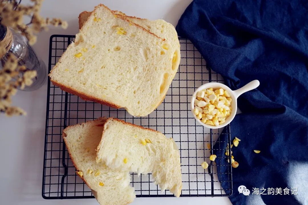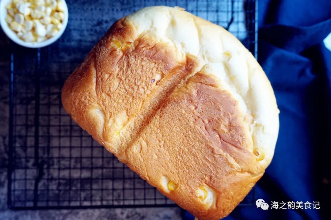 【材料】面包粉250克,牛奶138克左右(视面粉吸水性而定),细砂糖40克,盐2克,鸡蛋1个,奶粉8克,耐高糖酵母3.5克,黄油20克,甜玉米粒60克