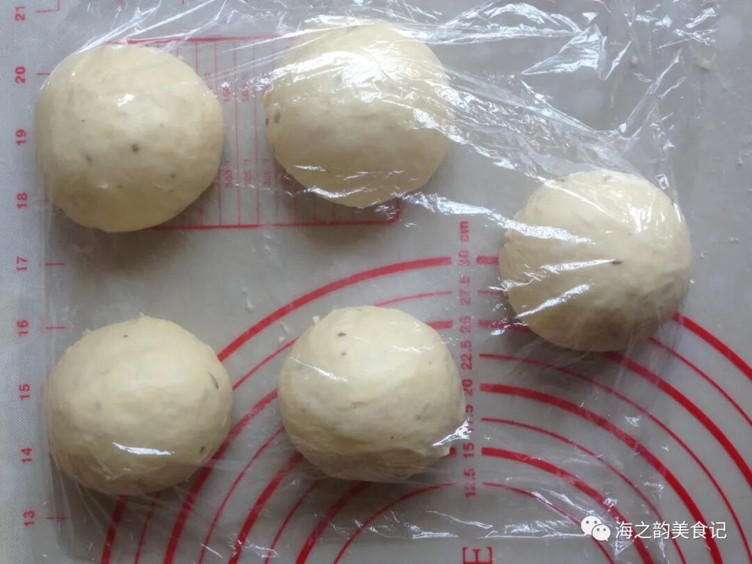 5、发酵好的面团用手轻压排气,用刮板把面团分割成5等份,滚圆后盖保鲜膜,松弛15分钟。