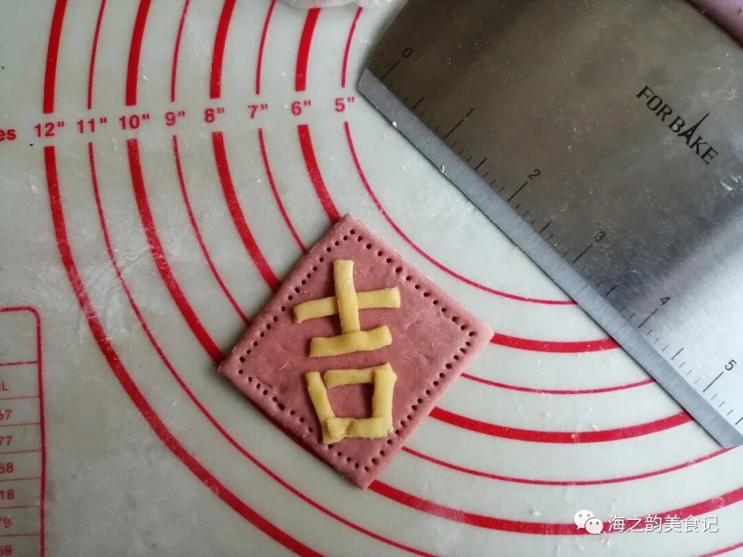 6、在小猪馒头醒发的时候,紧接着做母猪馒头,红色面团擀平,切成大的正方形,黄色面团搓细长,再压扁一下,切出适当的长度,拼出“吉”字,粘在红色面片上面。用牙签戳出一排小孔,这样大吉字就做好了。